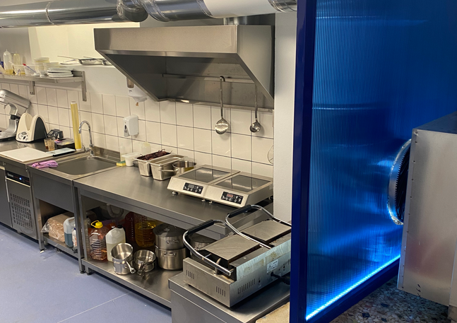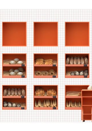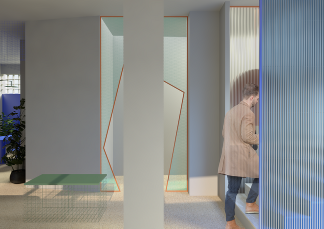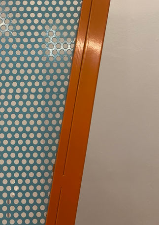 bakery and cafe in kypseli. this interior design project expertly combines a vibrant and contemporary aesthetic on the ground floor, with its striking orange color scheme, metal mesh accents, and innovative box displays that merge functionality and artistry. in the basement, a shift to soothing blue and turquoise hues is punctuated by energetic orange splashes, creating a harmonious transition between levels.